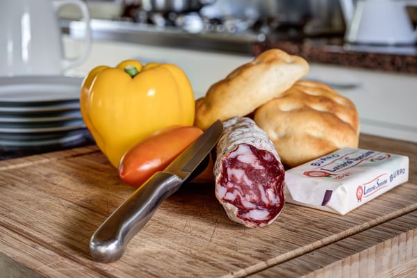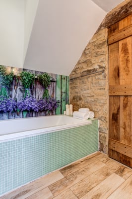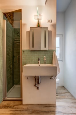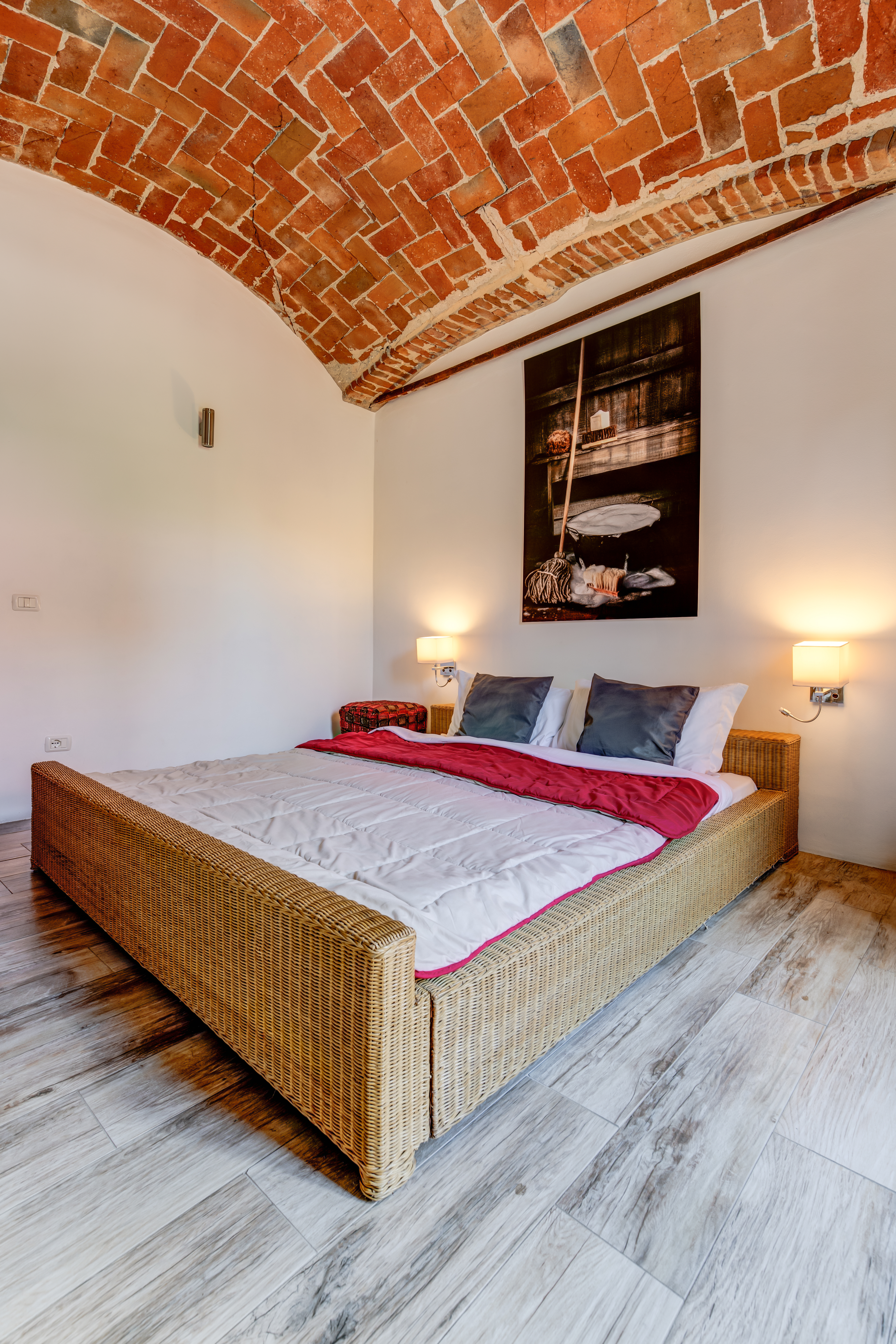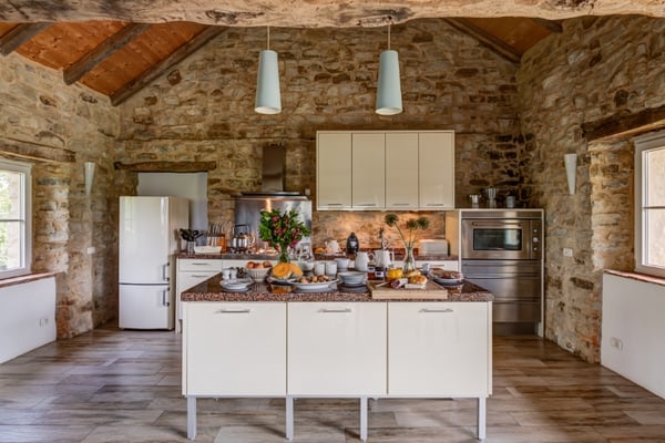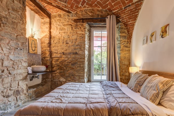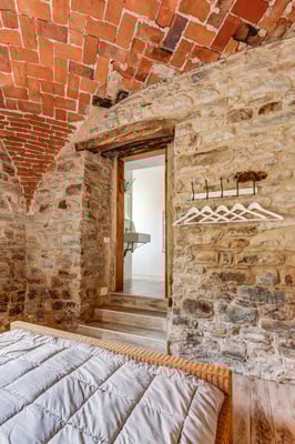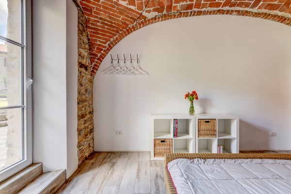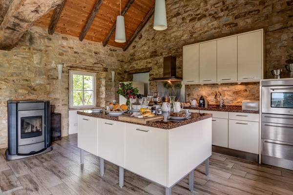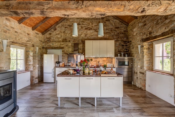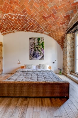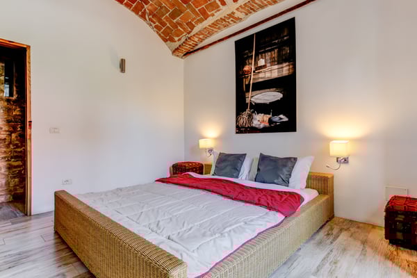 120 m2 auf zwei Etagen und Platz für bis zu 6 Personen. Im Erdgeschoss 3 Schlaf- und 3 Badezimmer in original Kreuzgewölbe, im Obergeschoss ein grosser, offener Wohn-/Ess-/Küchenbereich,