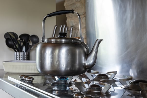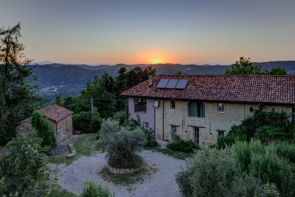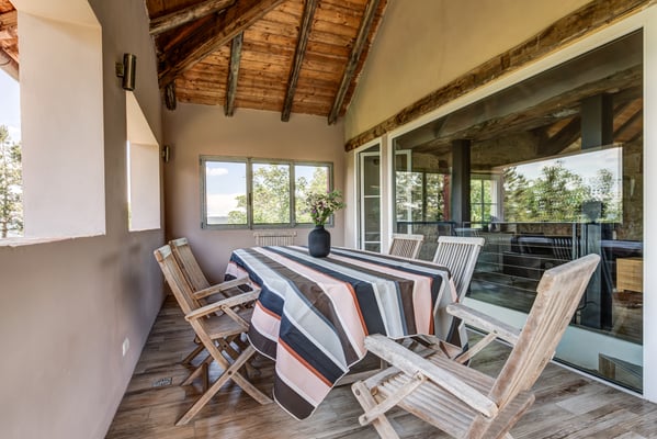 eine gedeckte Terrasse mit Brotofen und Blick bis in die Alpen.